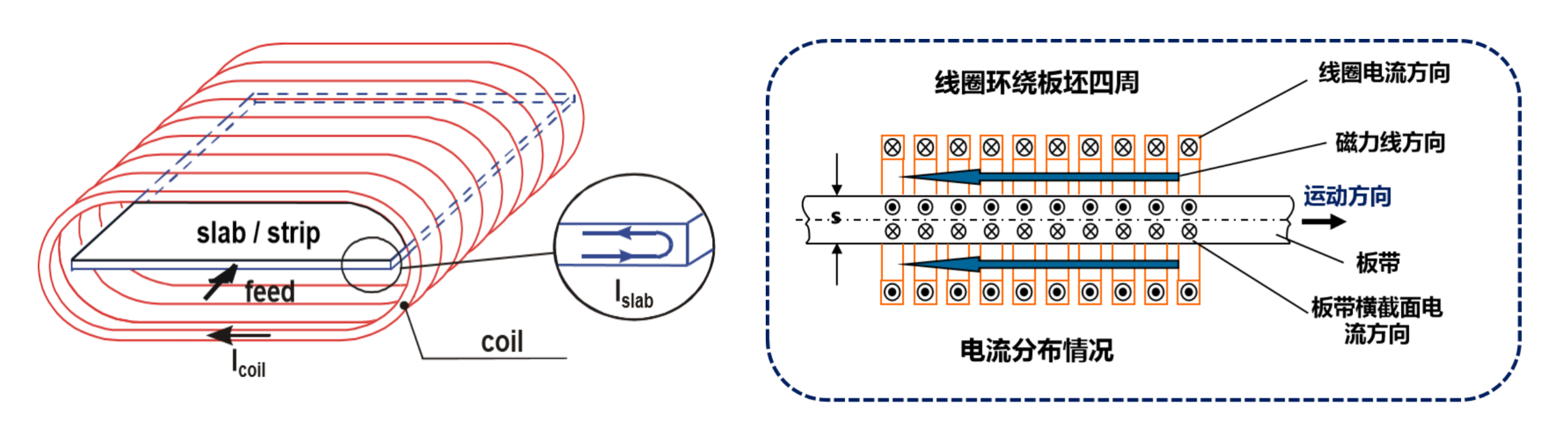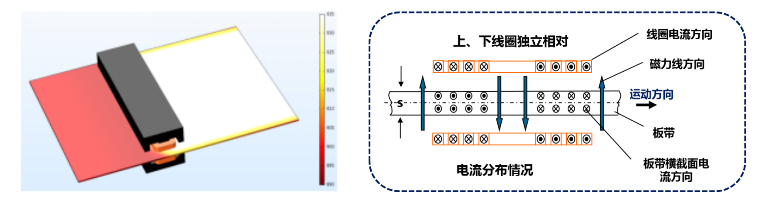 连轧板带在线电磁感应加热系统应用于精轧或粗轧前,采用电磁感应加热技术、智能变频控制技术,对板坯、板带进行整体加热或边部加热,满足轧制工艺需求温度,或解决轧制过程的角部碎边和边部裂纹问题,提升钢材的强度、韧性和耐磨性等力学性能,改善出炉成品的外观,并显著提升生产效率和综合收益。
